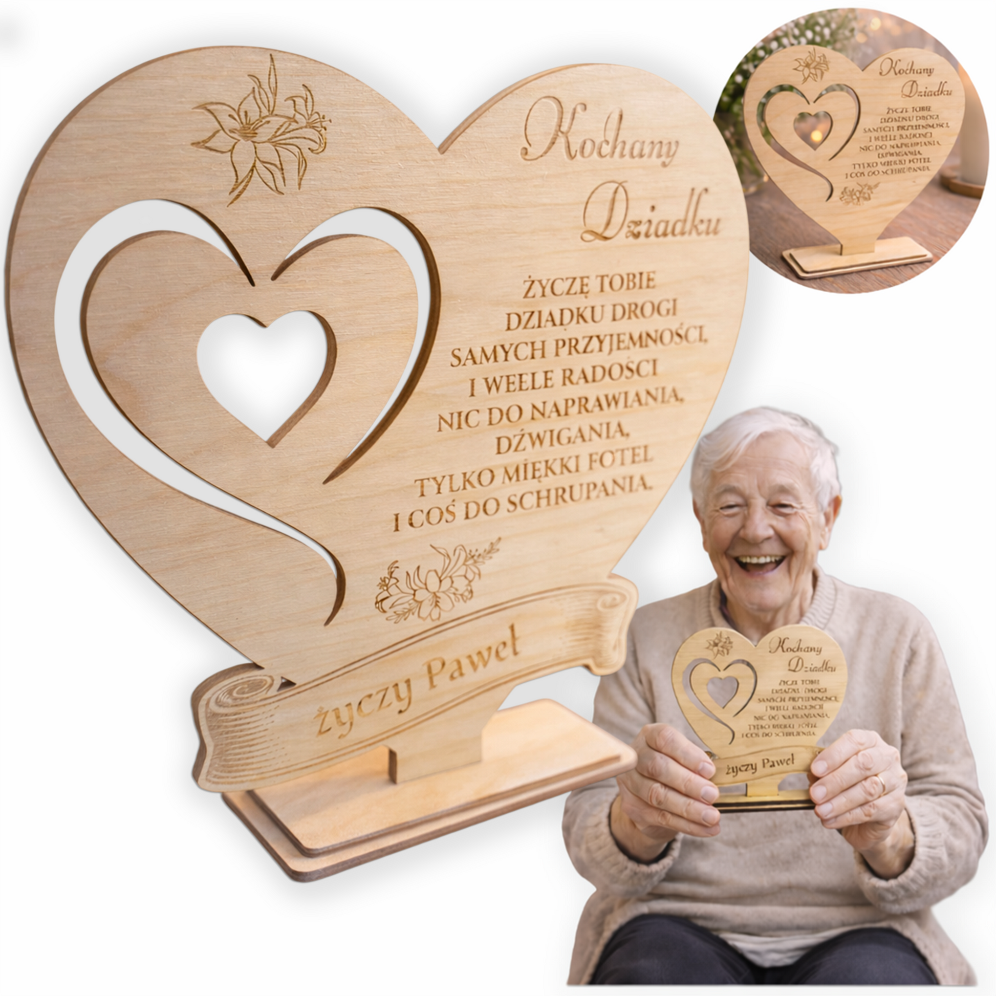 Eleganckie trofeum w kształcie serca z wycięciem i ozdobnym grawerem to wyjątkowy sposób, aby wyrazić wdzięczność i miłość dla ukochanego Dziadka. Wykonane z naturalnego drewna, z precyzyjnie naniesionymi życzeniami oraz osobistą dedykacją – stanowi piękną pamiątkę na długie lata. Stabilna podstawka pozwala na ustawienie dekoracji w widocznym miejscu, np. na półce, biurku lub komodzie.