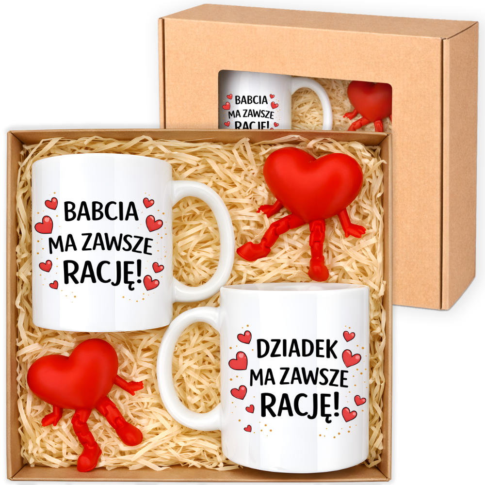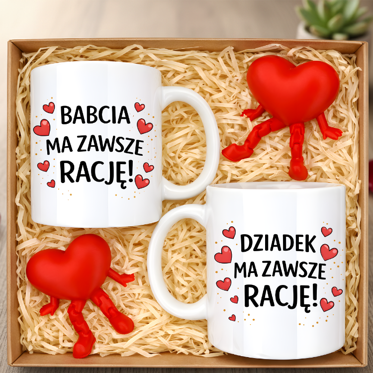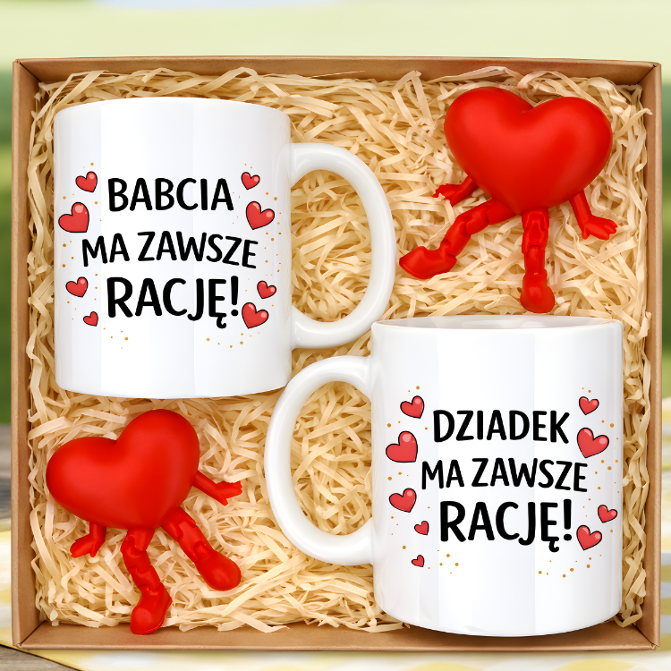 W zestawie są dwa ceramiczne kubki – jeden z napisem „Babcia ma zawsze rację!”, drugi z „Dziadek ma zawsze rację!”. Nadruki są kolorowe i trwałe.