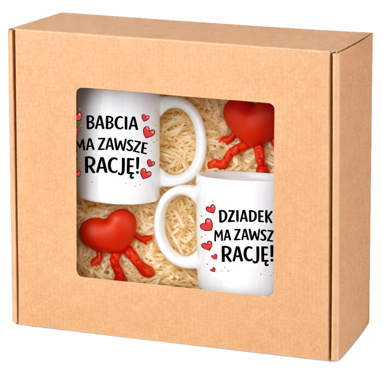 Szukasz fajnego i gotowego prezentu dla Babci i Dziadka? Ten zestaw sprawdzi się idealnie! W środku znajdziesz dwa kubki 330ml z nadrukiem, urocze serduszka z nóżkami oraz ładne pudełko prezentowe z dużym okienkiem, które robi świetne pierwsze wrażenie. Całość zapakowana w stylowy i przyjemny sposób – wystarczy wręczyć!